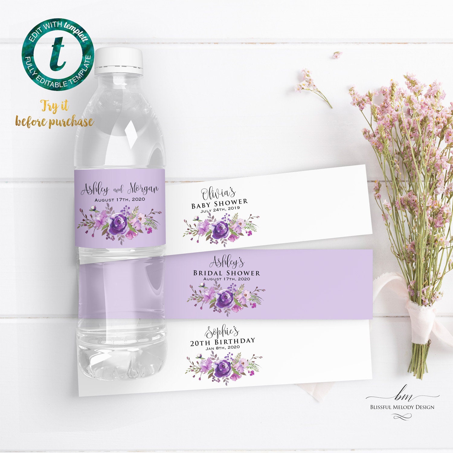 Printable Purple Lavender Floral Water Bottle Label, Wedding Bridal Shower Birthday Party, DIY Edit at Templett#07